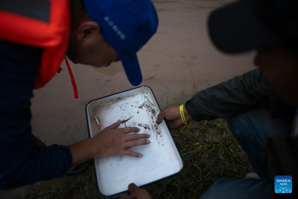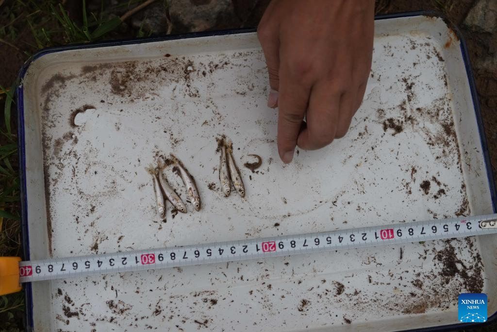 Qiao Qianglong (L), a member of a scientific expedition team of the Changjiang River Scientific Research Institute, conducts on-site fish monitoring at Zhimenda hydrologic station in Yushu Tibetan Autonomous Prefecture of northwest China's Qinghai Province, July 20, 2024. Chinese scientists launched an expedition on Saturday in the headwater regions of the Yangtze and Lancang rivers in northwest China's Qinghai Province, to investigate the regions' water resources and ecological environment.