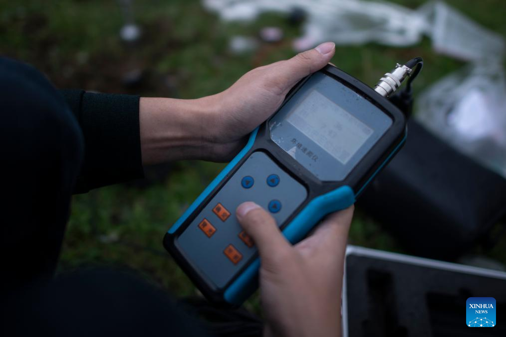 Liao Maoxin, a member of a scientific expedition team of the Changjiang River Scientific Research Institute, conducts soil multi-parameter detection at Zhimenda hydrologic station in Yushu Tibetan Autonomous Prefecture of northwest China's Qinghai Province, July 20, 2024. Chinese scientists launched an expedition on Saturday in the headwater regions of the Yangtze and Lancang rivers in northwest China's Qinghai Province, to investigate the regions' water resources and ecological environment.