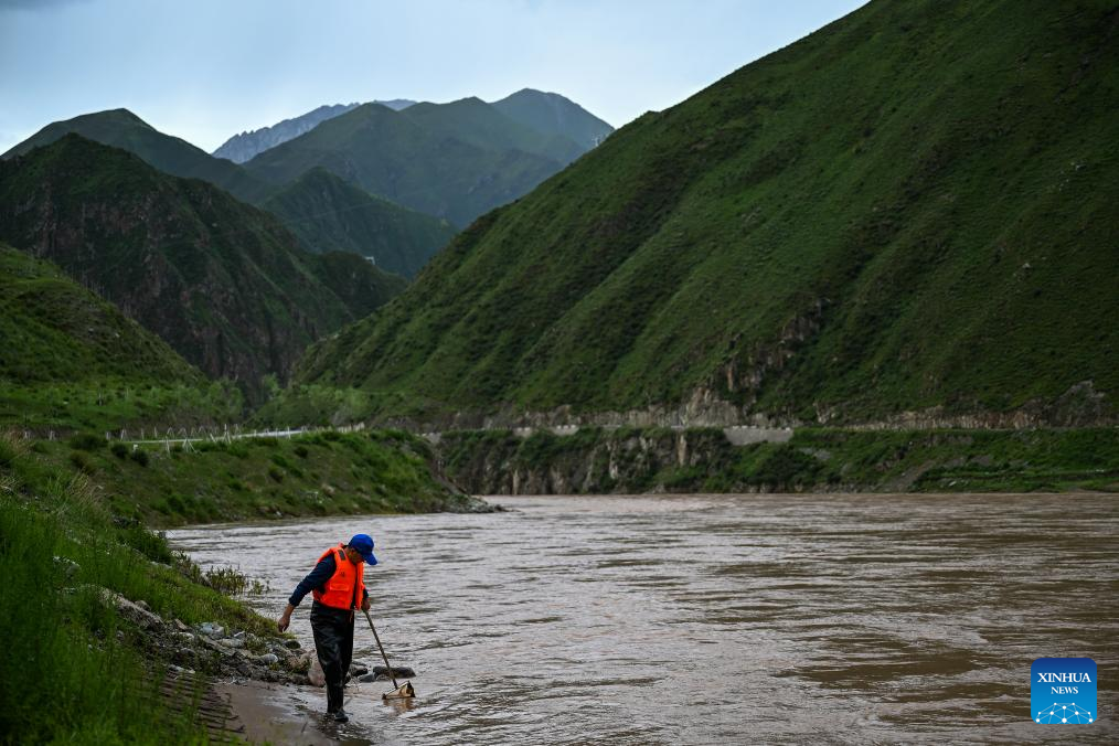 Qiao Qianglong, a member of a scientific expedition team of the Changjiang River Scientific Research Institute, conducts on-site fish monitoring at Zhimenda hydrologic station in Yushu Tibetan Autonomous Prefecture of northwest China's Qinghai Province, July 20, 2024. Chinese scientists launched an expedition on Saturday in the headwater regions of the Yangtze and Lancang rivers in northwest China's Qinghai Province, to investigate the regions' water resources and ecological environment.