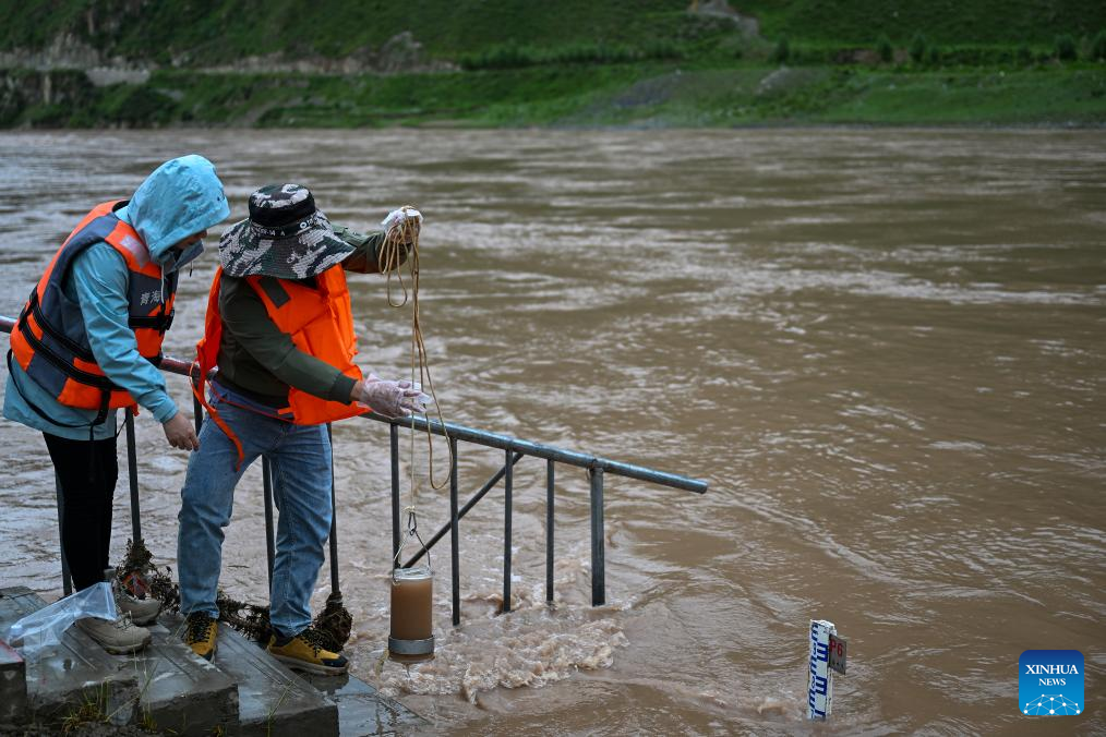 Han Cheng (R), a member of a scientific expedition team of the Changjiang River Scientific Research Institute, collects water sample at Zhimenda hydrologic station in Yushu Tibetan Autonomous Prefecture of northwest China's Qinghai Province, July 20, 2024. Chinese scientists launched an expedition on Saturday in the headwater regions of the Yangtze and Lancang rivers in northwest China's Qinghai Province, to investigate the regions' water resources and ecological environment.