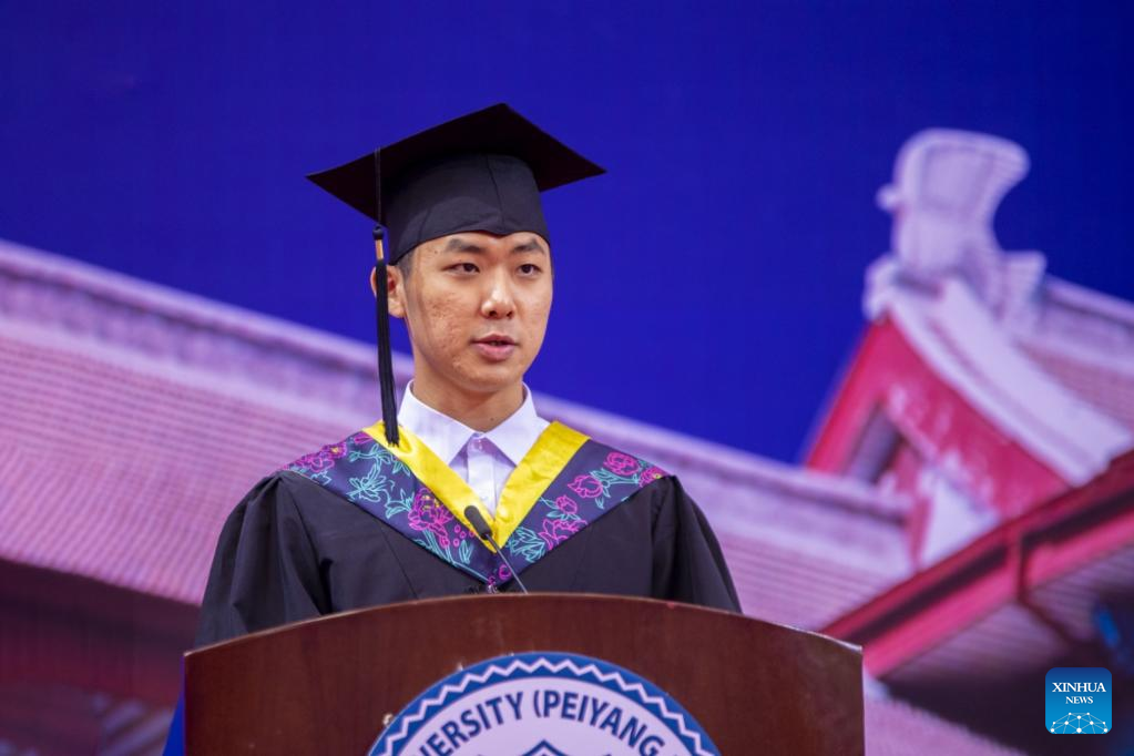 Foong Yan Lin, a Malaysian graduate, speaks at Tianjin University's 2024 commencement ceremony for undergraduate students in north China's Tianjin on July 6, 2024.(Tianjin University/Handout via Xinhua)