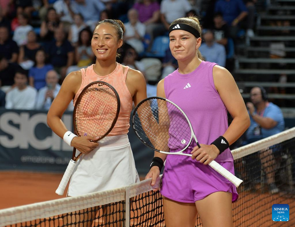 Zheng Qinwen (L) and Karolina Muchova pose for photos prior to the final match between Zheng Qinwen of China and Karolina Muchova of Czech Republic at the 35th Palermo Ladies Open in Palermo, Italy, July 21, 2024. (Photo by Alberto Lingria/Xinhua)