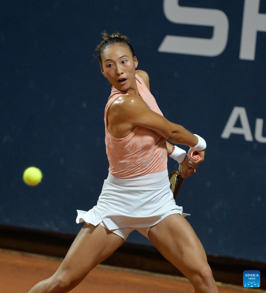 Zheng Qinwen hits a return during the final match between Zheng Qinwen of China and Karolina Muchova of Czech Republic at the 35th Palermo Ladies Open in Palermo, Italy, July 21, 2024. (Photo by Alberto Lingria/Xinhua)
