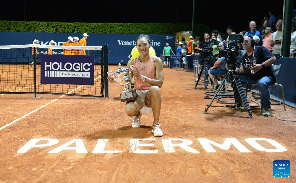 Zheng Qinwen celebrates with the trophy after winning the final match between Zheng Qinwen of China and Karolina Muchova of Czech Republic at the 35th Palermo Ladies Open in Palermo, Italy, July 21, 2024. (Photo by Alberto Lingria/Xinhua)