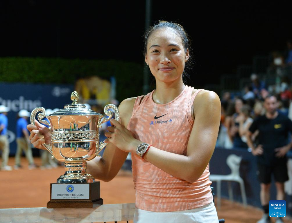 Zheng Qinwen poses with the trophy after winning the final match between Zheng Qinwen of China and Karolina Muchova of Czech Republic at the 35th Palermo Ladies Open in Palermo, Italy, July 21, 2024. (Photo by Alberto Lingria/Xinhua)