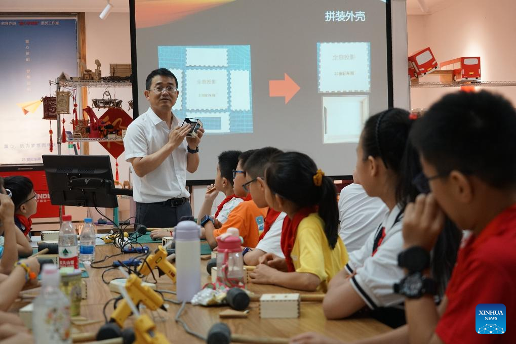 Children assemble holographic projectors at the "21st Century Workshop" in Ningbo, east China's Zhejiang Province, July 15, 2024.