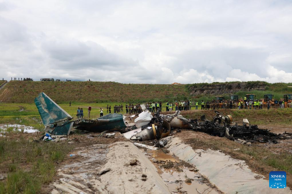 This photo taken on July 24, 2024 shows the site of an air crash at the Tribhuvan International Airport in Kathmandu, Nepal. Eighteen dead bodies have been recovered after a plane crashed on Wednesday at the Tribhuvan International Airport in Kathmandu, Nepal's capital, said Hansa Raj Pandey, spokesman at the Civil Aviation Authority of Nepal (CAAN). (Photo by Sulav Shrestha/Xinhua)