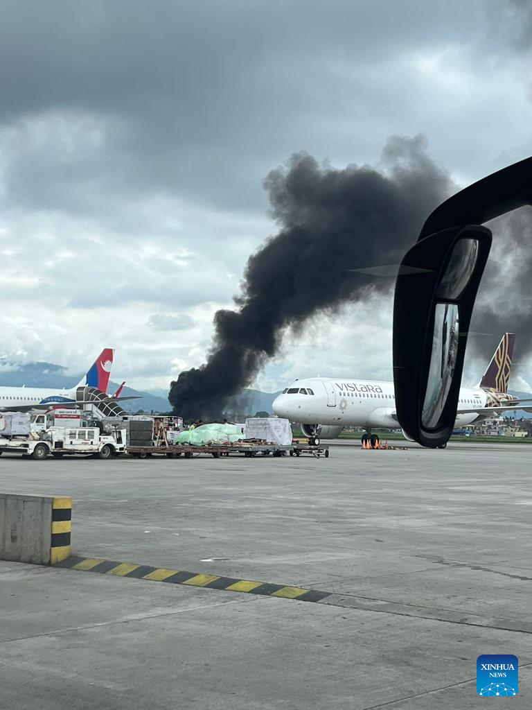This photo taken on July 24, 2024 shows smoke billowing from the site of an air crash at the Tribhuvan International Airport in Kathmandu, Nepal. Eighteen dead bodies have been recovered after a plane crashed on Wednesday at the Tribhuvan International Airport in Kathmandu, Nepal's capital, said Hansa Raj Pandey, spokesman at the Civil Aviation Authority of Nepal (CAAN). (Photo by Wang Xinyue/Xinhua)
