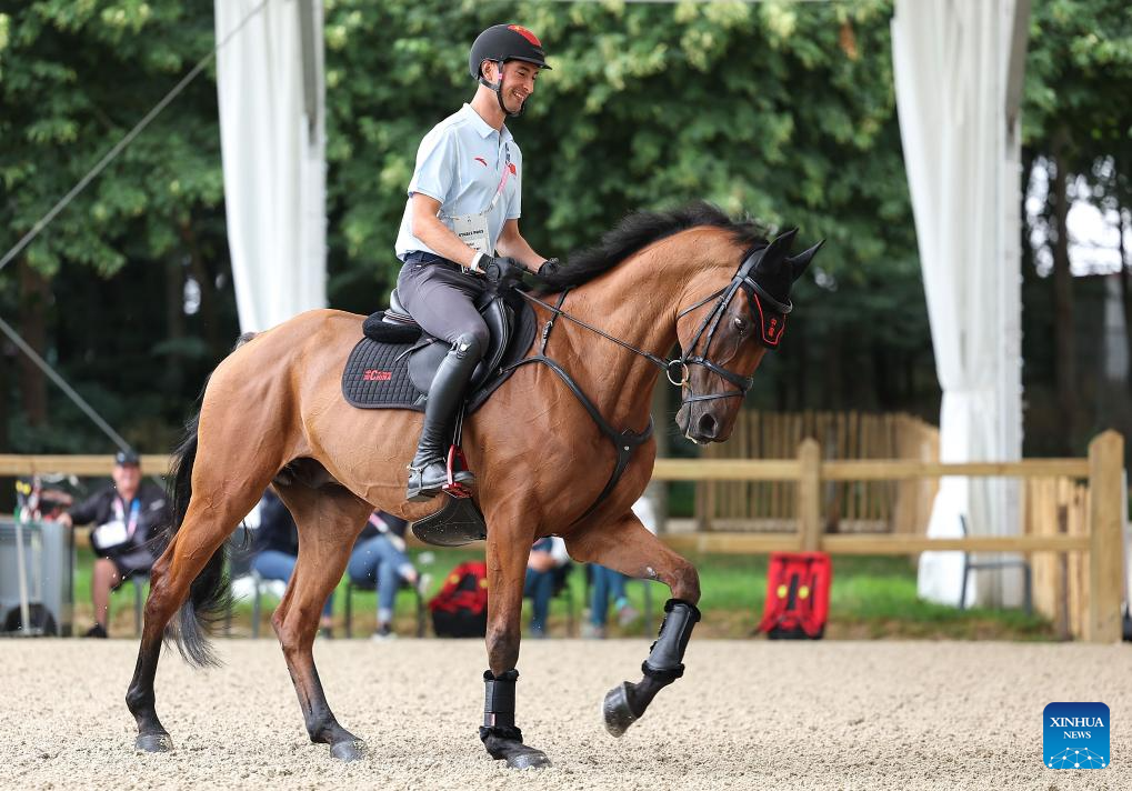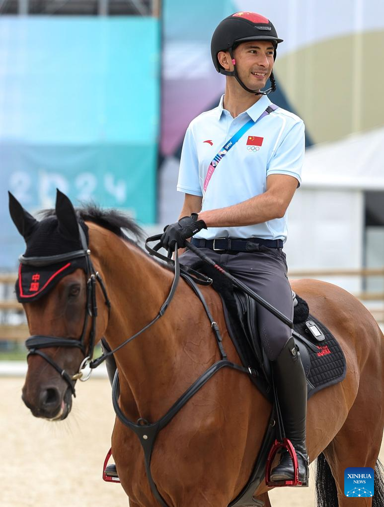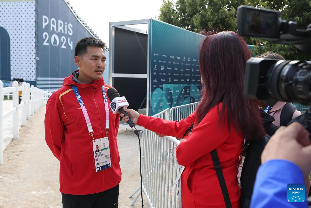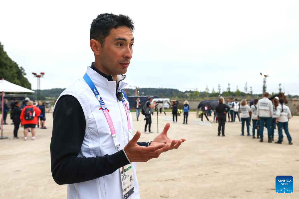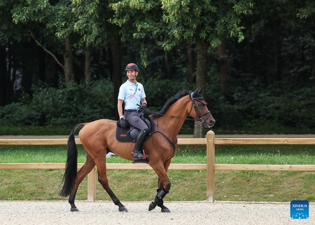 Chinese equestrian athlete Sun Huadong receives a media interview in a training session ahead of the Paris 2024 Olympic Games in Paris, France, July 24, 2024. (Xinhua/Yang Lei)