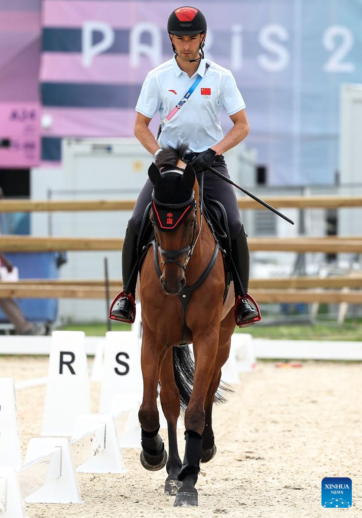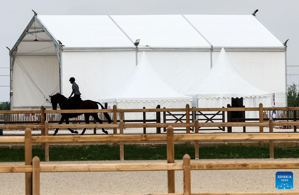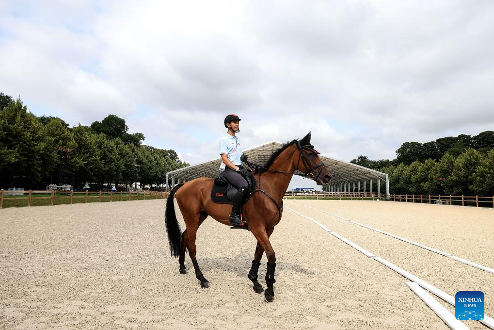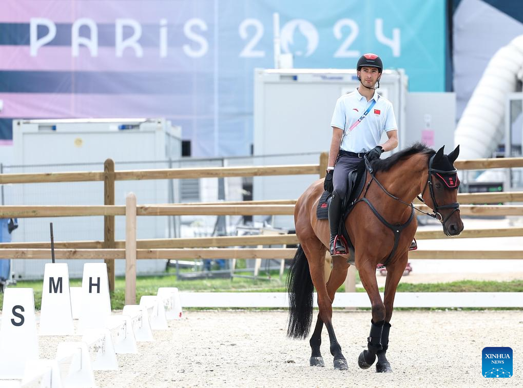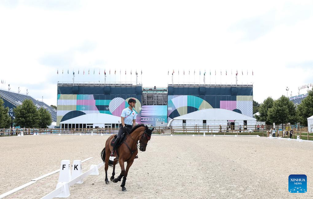 Chinese equestrian athlete Hua Tian takes part in a training session ahead of the Paris 2024 Olympic Games in Paris, France, July 24, 2024. (Xinhua/Yang Lei)