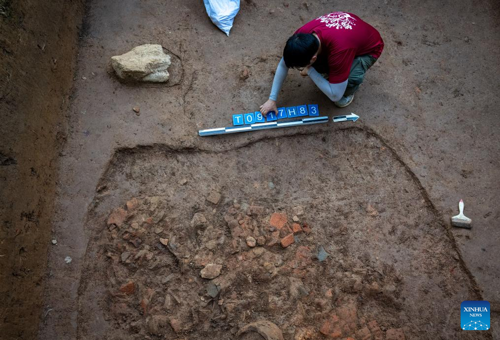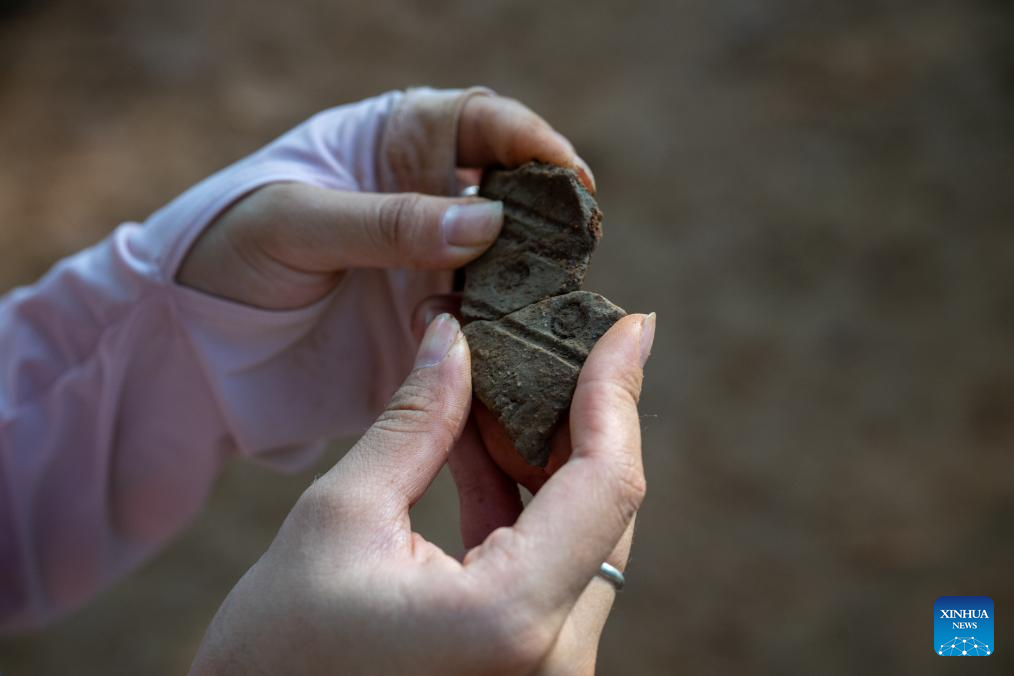 A participant from China puts pottery shreds together at an excavation site at the Panlongcheng National Archaeological Site Park in Wuhan, central China's Hubei Province, July 24, 2024. As part of Wuhan University's summer programs, the international summer school on archaeology is held at the Panlongcheng National Archaeological Site Park in Wuhan. This school offers opportunities to 9 students from home and abroad to participate in a five-week program, including lectures and field work. (Xinhua/Hu Jingwen)