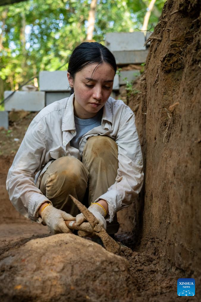 A participant from Singapore works at an excavation site at the Panlongcheng National Archaeological Site Park in Wuhan, central China's Hubei Province, July 24, 2024. As part of Wuhan University's summer programs, the international summer school on archaeology is held at the Panlongcheng National Archaeological Site Park in Wuhan. This school offers opportunities to 9 students from home and abroad to participate in a five-week program, including lectures and field work. (Xinhua/Hu Jingwen)