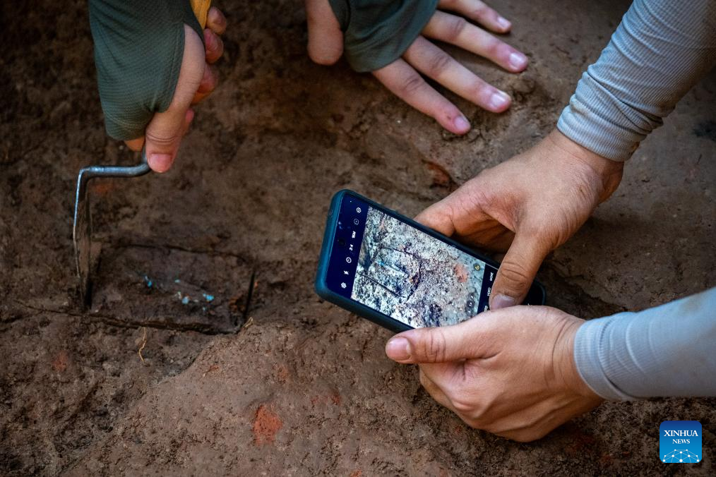 A participant from Singapore takes a photo of a bronze ware at an excavation site at the Panlongcheng National Archaeological Site Park in Wuhan, central China's Hubei Province, July 24, 2024. As part of Wuhan University's summer programs, the international summer school on archaeology is held at the Panlongcheng National Archaeological Site Park in Wuhan. This school offers opportunities to 9 students from home and abroad to participate in a five-week program, including lectures and field work. (Xinhua/Hu Jingwen)
