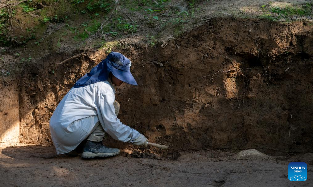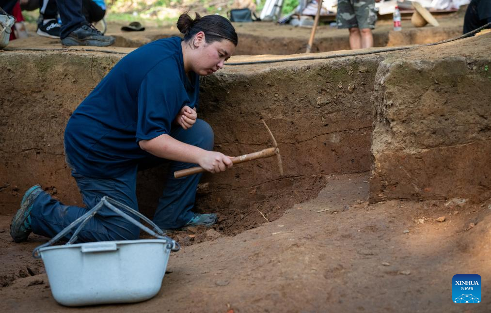 A participant from the United States works at an excavation site at the Panlongcheng National Archaeological Site Park in Wuhan, central China's Hubei Province, July 24, 2024. As part of Wuhan University's summer programs, the international summer school on archaeology is held at the Panlongcheng National Archaeological Site Park in Wuhan. This school offers opportunities to 9 students from home and abroad to participate in a five-week program, including lectures and field work. (Xinhua/Hu Jingwen)