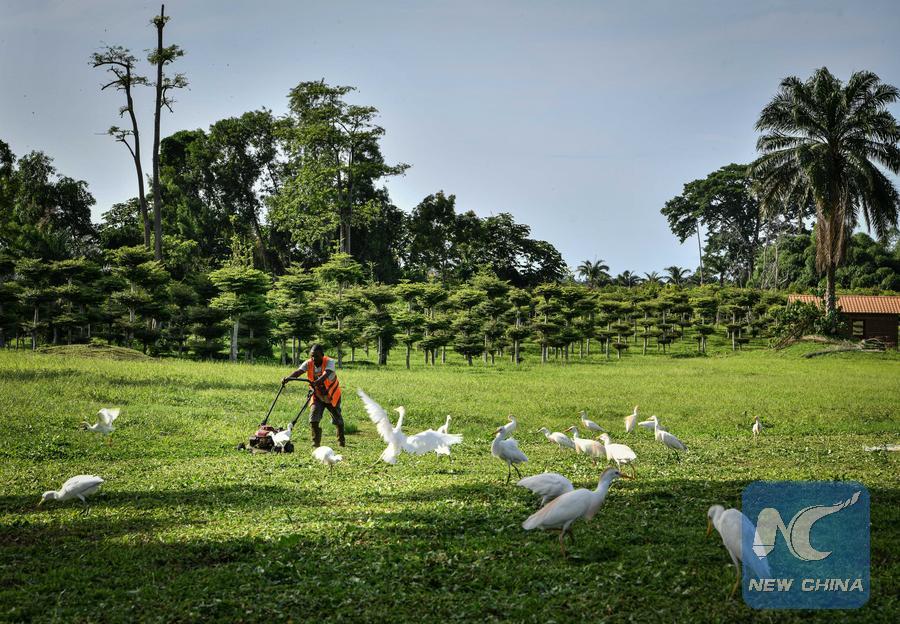 A gardener operates a lawn mower in Malabo National Park in Malabo, the capital of Equatorial Guinea, May 18, 2024. (Xinhua/Han Xu)