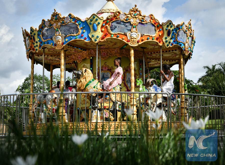 Visitors ride a carousel at Malabo National Park in Malabo, the capital of Equatorial Guinea, May 19, 2024. (Xinhua/Han Xu)