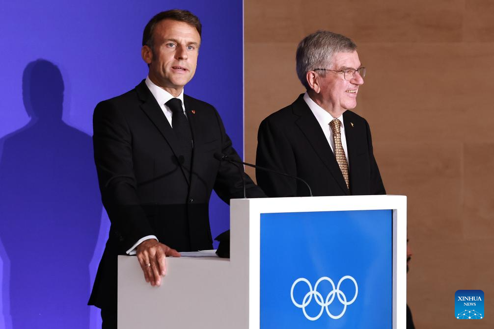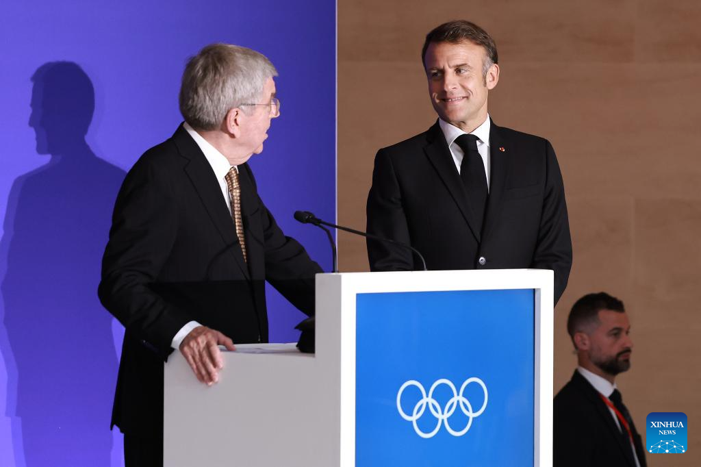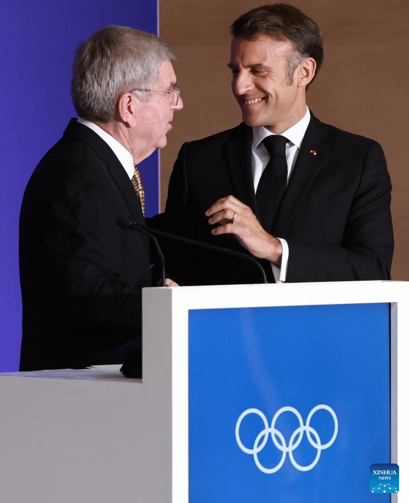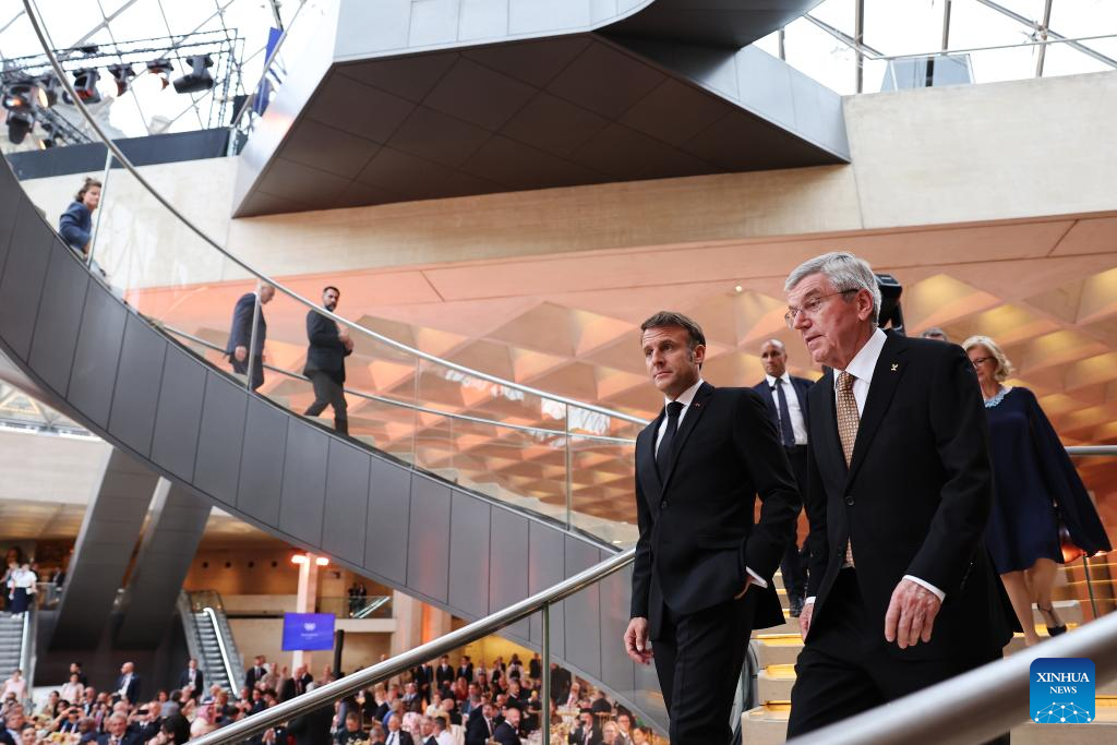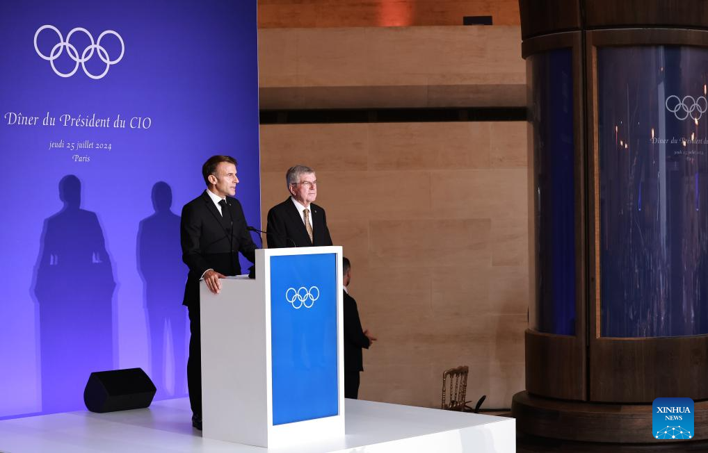 International Olympic Committee (IOC) President Thomas Bach (R, front) and French President Emmanuel Macron attend the IOC & Elysee Dinner at the Louvre in Paris, France, on July 25, 2024. (Photo by Arturo Holmes/POOL/Xinhua)