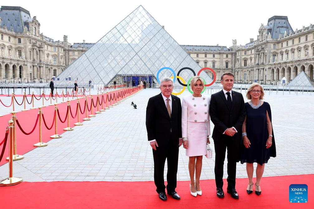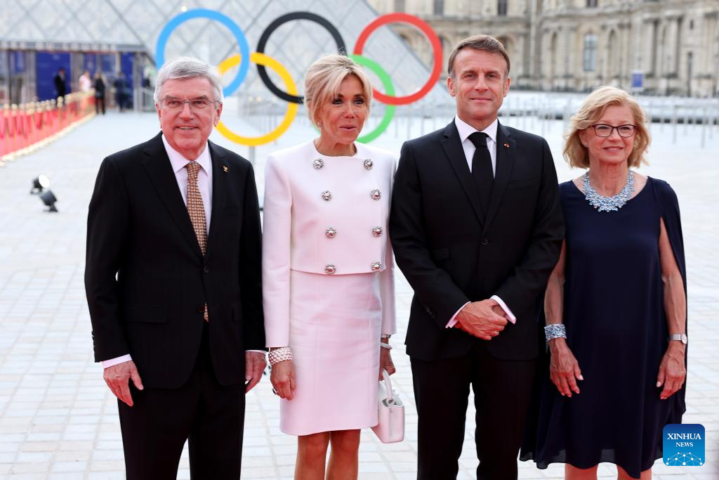 International Olympic Committee (IOC) President Thomas Bach (1st L) and his wife Claudia Bach (1st R) pose with French President Emmanuel Macron (2nd R) and his wife Brigitte Macron during the IOC & Elysee Dinner at the Louvre in Paris, France, on July 25, 2024. (Photo by Arturo Holmes/POOL/Xinhua)