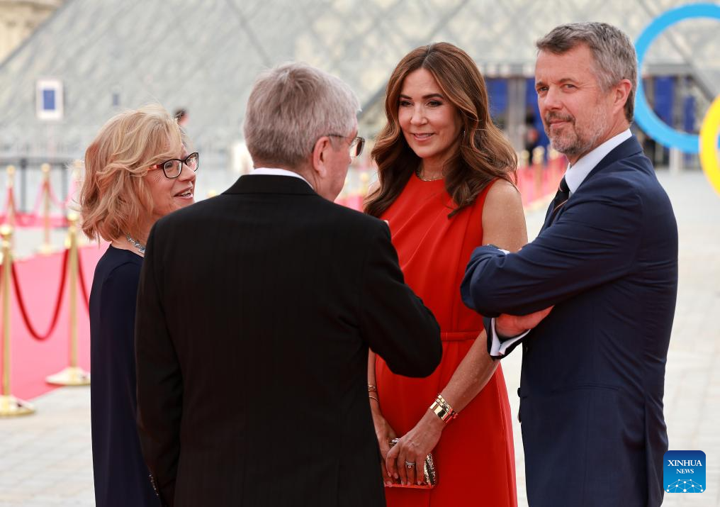 International Olympic Committee (IOC) President Thomas Bach (2nd L) and his wife Claudia Bach (1st L) greet Danish King Frederik X (1st R) and Queen Mary as they attend the IOC & Elysee Dinner at the Louvre in Paris, France, on July 25, 2024. (Photo by Arturo Holmes/POOL/Xinhua)