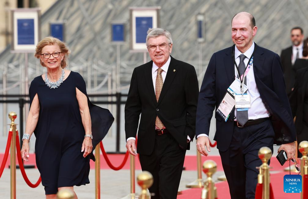 International Olympic Committee (IOC) President Thomas Bach (C) and his wife Claudia Bach (L) attend the IOC & Elysee Dinner at the Louvre in Paris, France, on July 25, 2024. (Photo by Arturo Holmes/POOL/Xinhua)