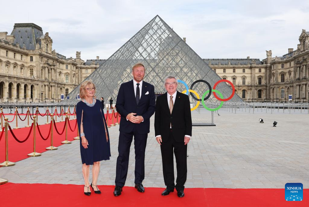 International Olympic Committee (IOC) President Thomas Bach (R) and his wife Claudia Bach (L) pose with Dutch King Willem-Alexander as they attend the IOC & Elysee Dinner at the Louvre in Paris, France, on July 25, 2024. (Photo by Arturo Holmes/POOL/Xinhua)