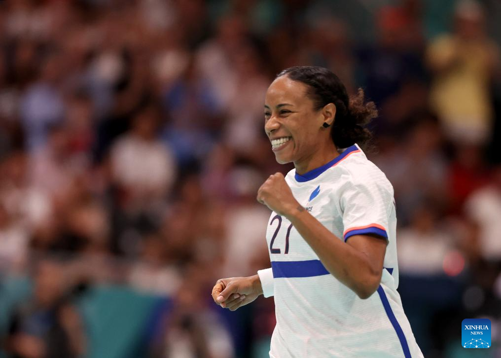 Estelle Nze Minko of France reacts during the women's handball preliminary round group B match between France and Hungary of the Paris 2024 Olympic Games in Paris, France, on July 25, 2024. (Xinhua/Li Ying)