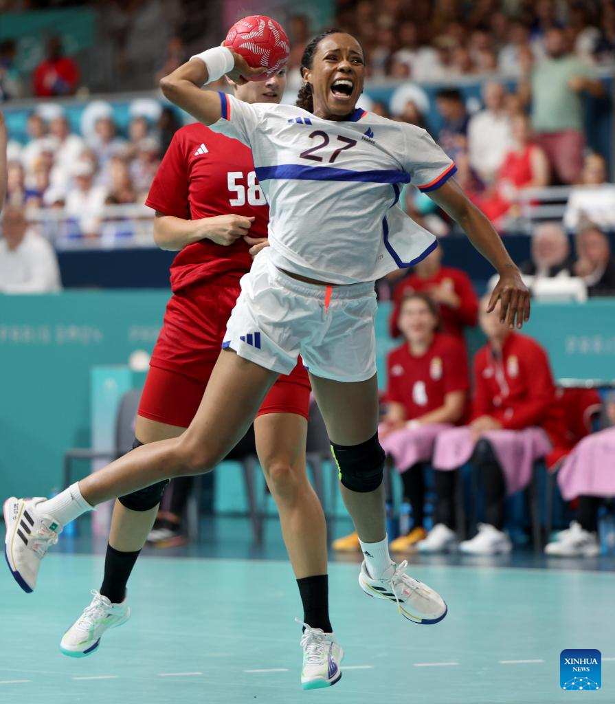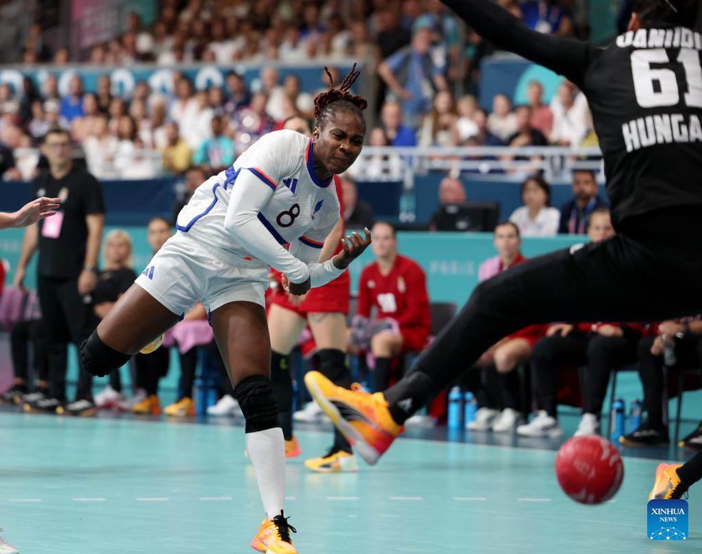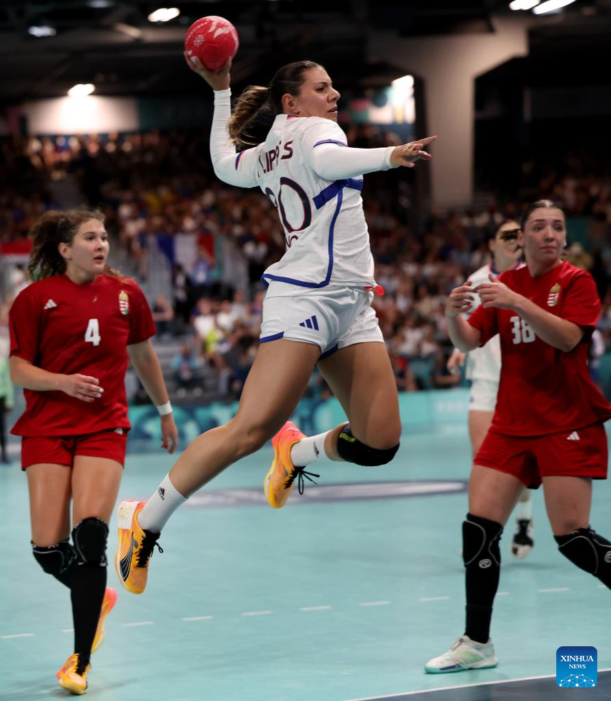 Laura Flippes (C) of France competes during the women's handball preliminary round group B match between France and Hungary of the Paris 2024 Olympic Games in Paris, France, on July 25, 2024. (Xinhua/Li Ying)