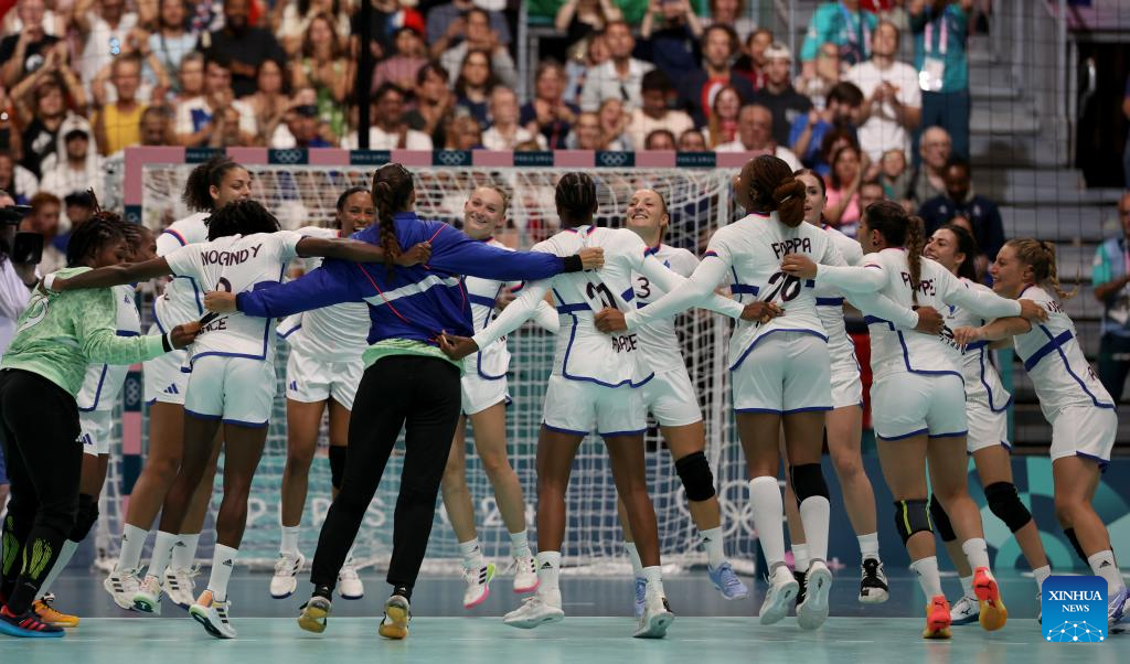 Players of France celebrate after winning the women's handball preliminary round group B match between France and Hungary of the Paris 2024 Olympic Games in Paris, France, on July 25, 2024. (Xinhua/Li Ying)