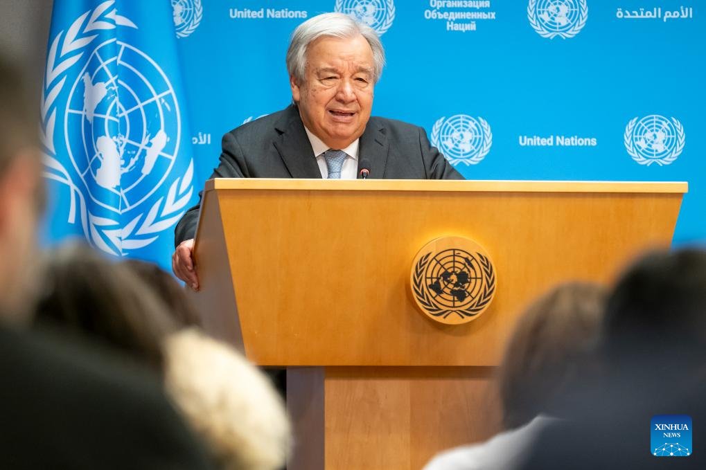 UN Secretary-General Antonio Guterres speaks to the press on extreme heat at the UN headquarters in New York, on July 25, 2024. Guterres on Thursday called for global action to tackle extreme heat, as "extreme temperatures are no longer a one day, one week or one month phenomenon." (Mark Garten/UN Photo/Handout via Xinhua)