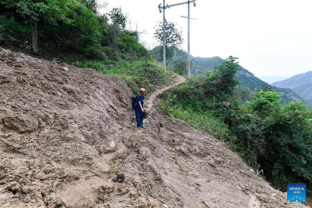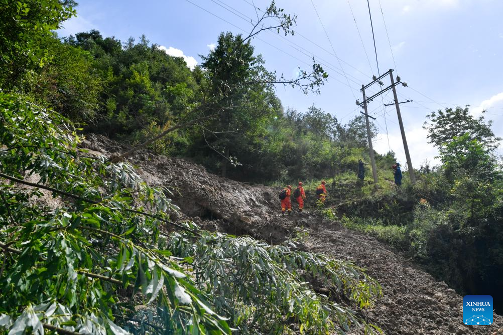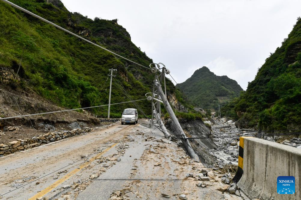 Photo taken on July 26, 2024 shows power lines destroyed by floods and landslides on a road to Yaogou Village of Wudu District in Longnan City, northwest China's Gansu Province. From Monday to Wednesday, Gansu experienced the heaviest rainfall this year, marking the most severe round of downpours since 1961 in the province, said the provincial meteorological bureau. Locals in Longnan are racing against time to repair flood-hit infrastructure and put life back to normal. (Xinhua/Lang Bingbing)