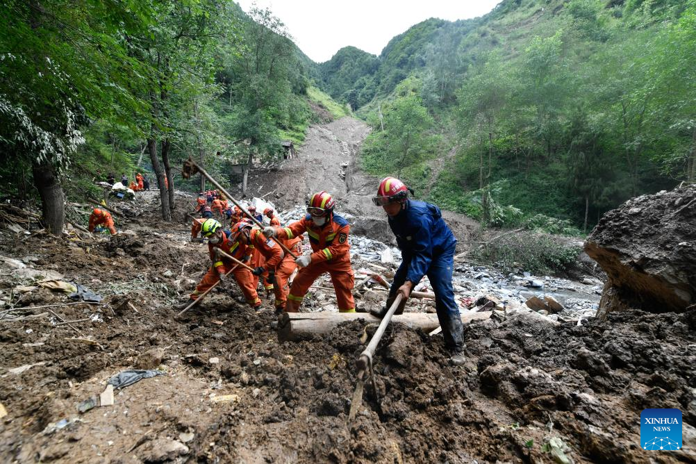 Rescuers operate at Yaogou Village of Wudu District in Longnan City, northwest China's Gansu Province, July 26, 2024. From Monday to Wednesday, Gansu experienced the heaviest rainfall this year, marking the most severe round of downpours since 1961 in the province, said the provincial meteorological bureau. Locals in Longnan are racing against time to repair flood-hit infrastructure and put life back to normal. (Xinhua/Lang Bingbing)