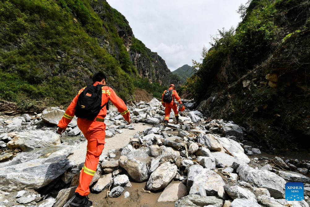 Rescuers walk to Yaogou Village of Wudu District in Longnan City, northwest China's Gansu Province, July 26, 2024. From Monday to Wednesday, Gansu experienced the heaviest rainfall this year, marking the most severe round of downpours since 1961 in the province, said the provincial meteorological bureau. Locals in Longnan are racing against time to repair flood-hit infrastructure and put life back to normal. (Xinhua/Lang Bingbing)