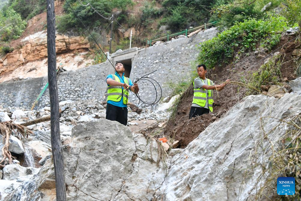 Engineers repair disrupted telecommunication lines at Yaogou Village of Wudu District in Longnan City, northwest China's Gansu Province, July 26, 2024. From Monday to Wednesday, Gansu experienced the heaviest rainfall this year, marking the most severe round of downpours since 1961 in the province, said the provincial meteorological bureau. Locals in Longnan are racing against time to repair flood-hit infrastructure and put life back to normal. (Xinhua/Lang Bingbing)