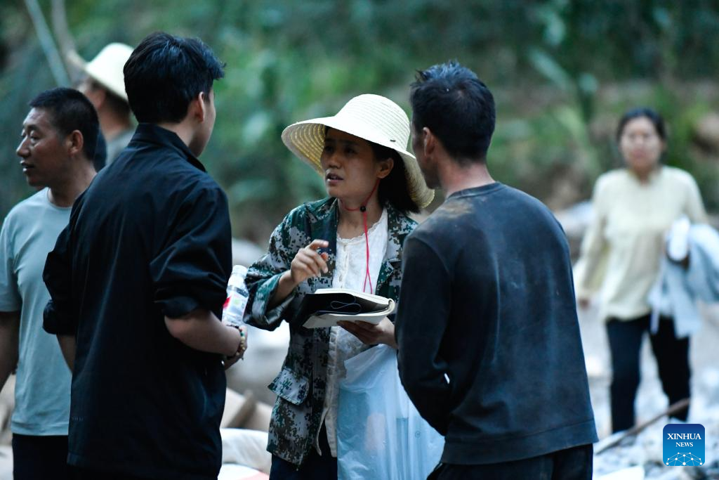 One of the rescuers points to a spot when he recounts their efforts to access Yaogou Village of Wudu District in Longnan City, northwest China's Gansu Province, July 26, 2024. From Monday to Wednesday, Gansu experienced the heaviest rainfall this year, marking the most severe round of downpours since 1961 in the province, said the provincial meteorological bureau. Locals in Longnan are racing against time to repair flood-hit infrastructure and put life back to normal. (Xinhua/Lang Bingbing)