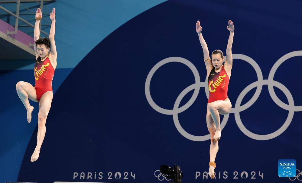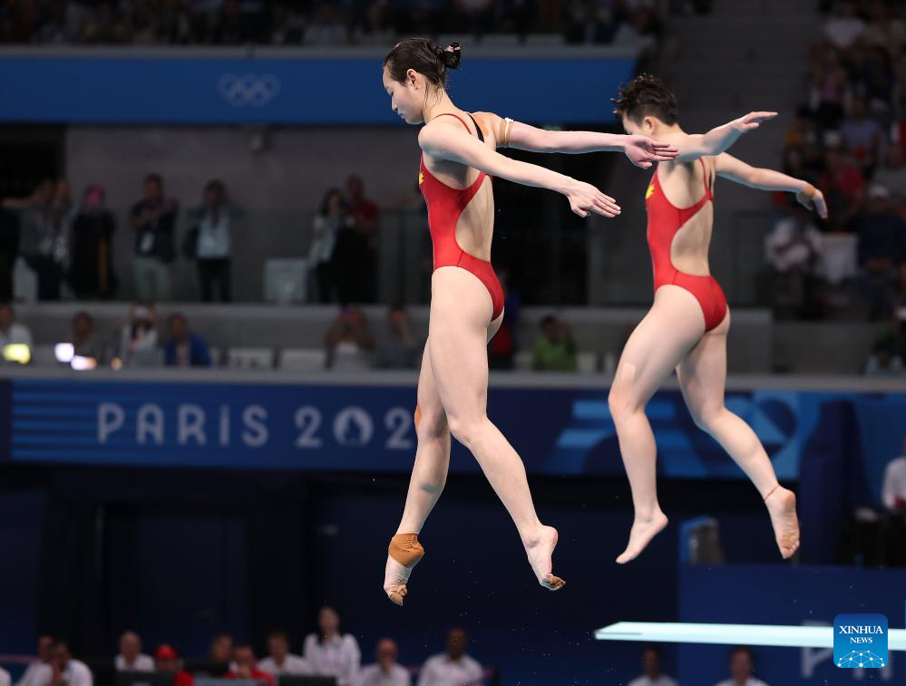 Chang Yani (L)/Chen Yiwen of China compete during the women's synchronised 3m springboard final of diving at the Paris 2024 Olympic Games in Saint Denis, near Paris, France, on July 27, 2024. (Xinhua/Li Ming)
