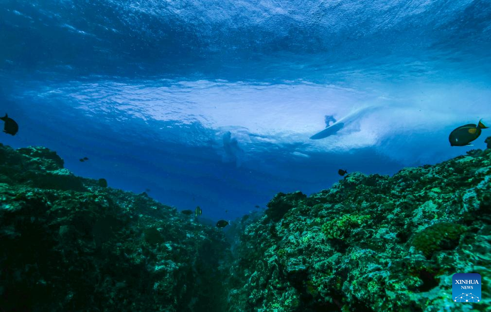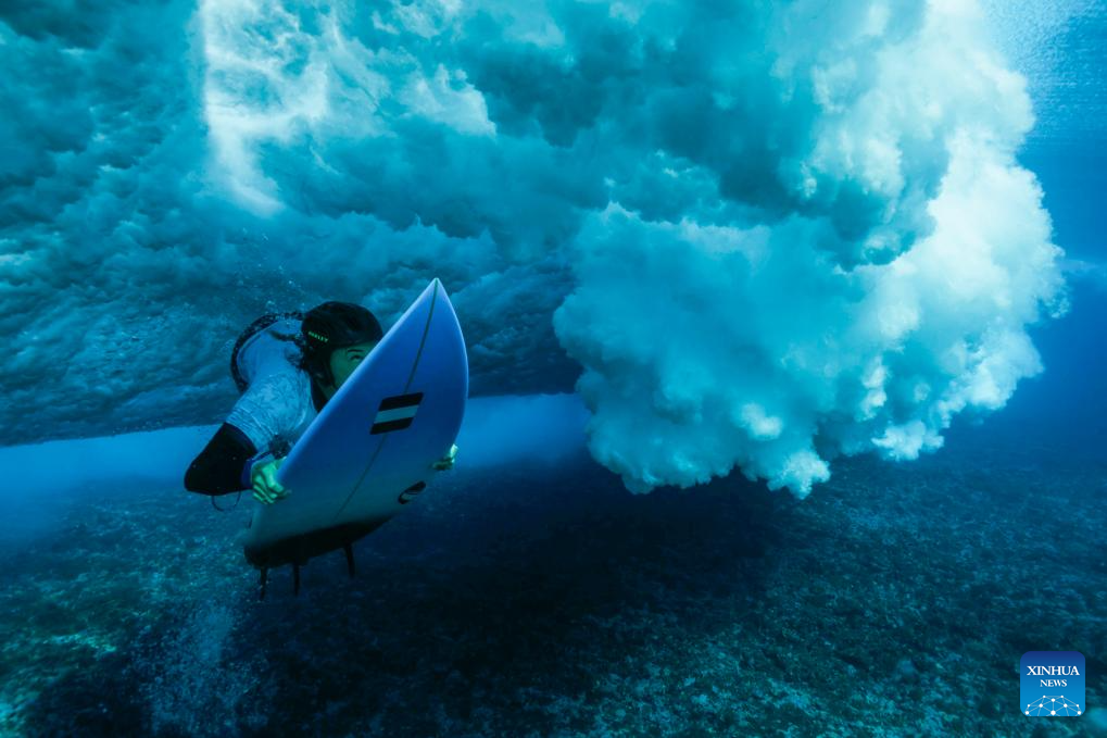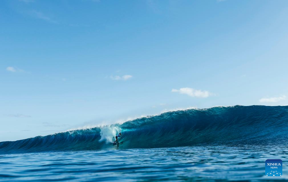 A surfer catches a wave during a surfing training session in Teahupo'o, on the French Polynesian Island of Tahiti, on July 26, 2024, ahead of the Paris 2024 Olympic Games. (Photo by Ben Thouard/POOL/Xinhua)