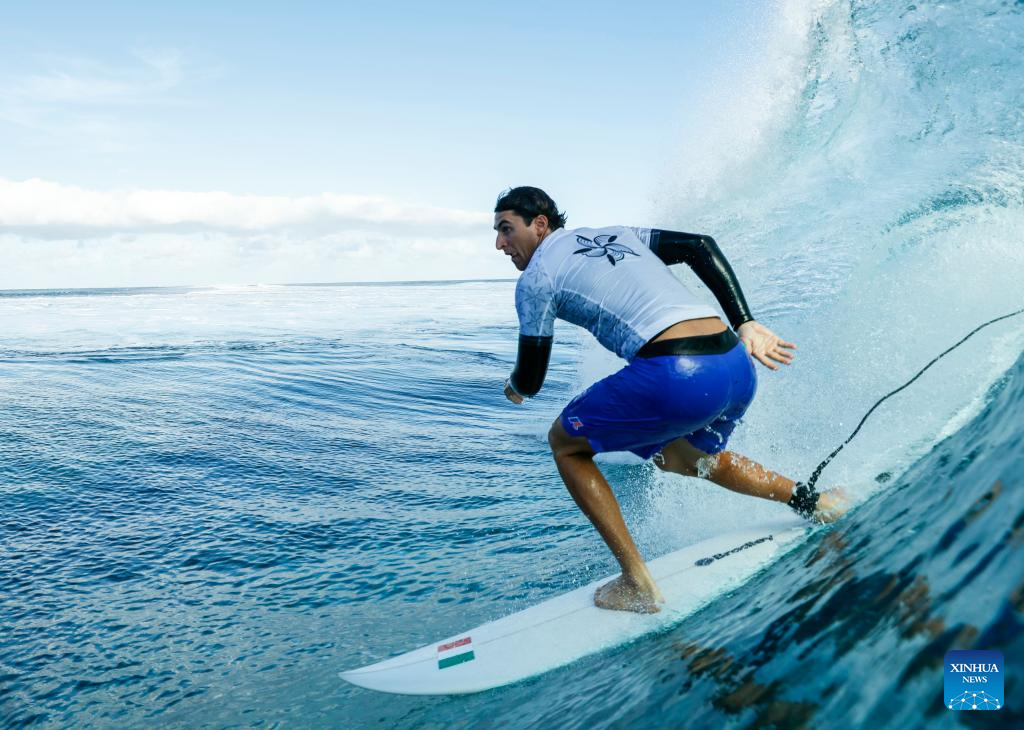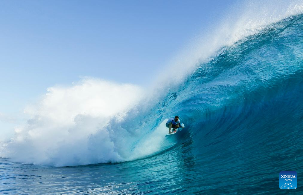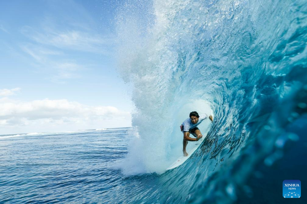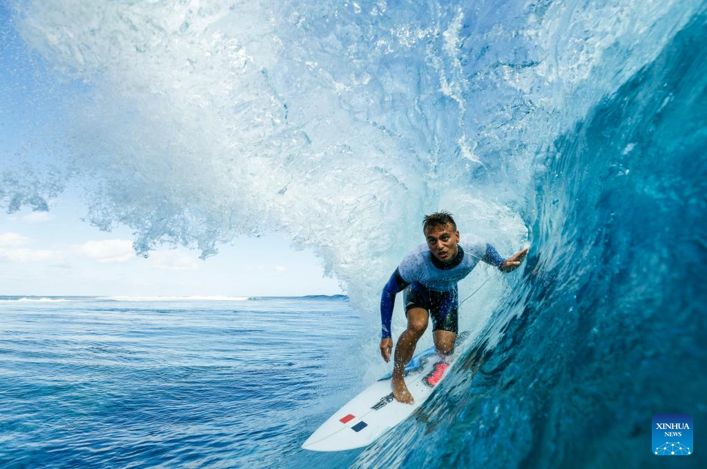 Italy's Leonardo Fioravanti cathces a wave during a surfing training session in Teahupo'o, on the French Polynesian Island of Tahiti, on July 26, 2024, ahead of the Paris 2024 Olympic Games. (Photo by Ben Thouard/POOL/Xinhua)