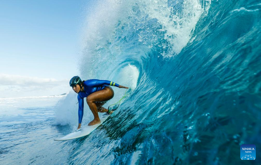 Brazil's Taina Hinckel catches a wave during a surfing training session in Teahupo'o, on the French Polynesian Island of Tahiti, on July 26, 2024, ahead of the Paris 2024 Olympic Games. (Photo by Ben Thouard/POOL/Xinhua)