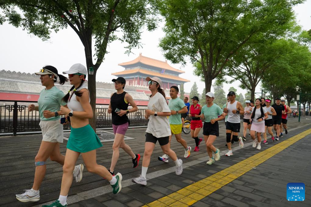 Joggers run past the Shenwu Gate of the Forbidden City in Beijing, capital of China, June 22, 2024. (Xinhua/Ju Huanzong)