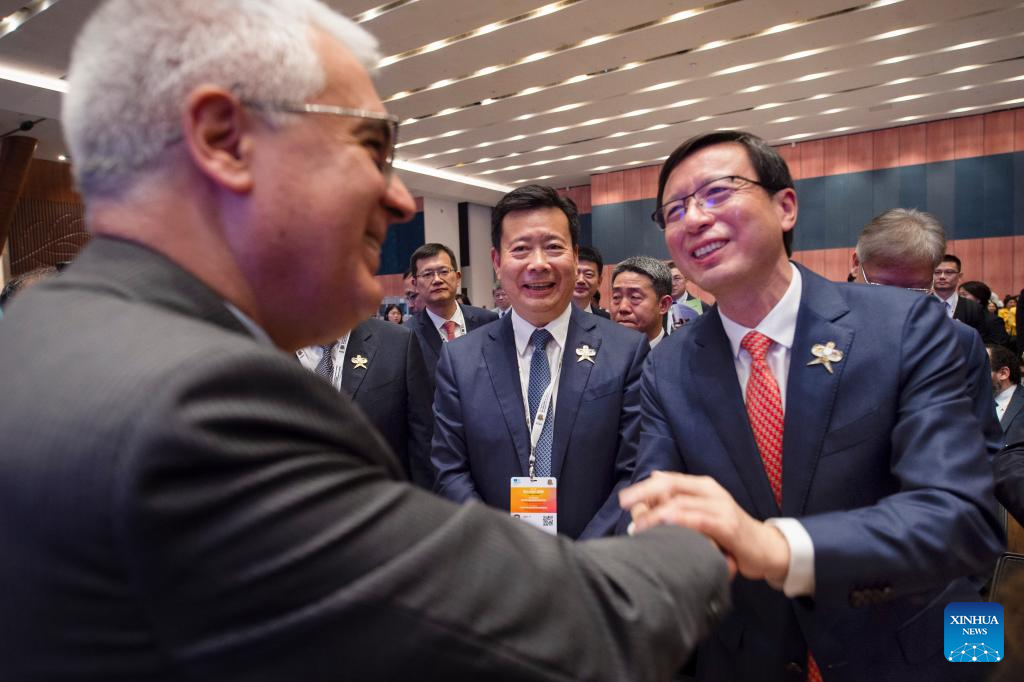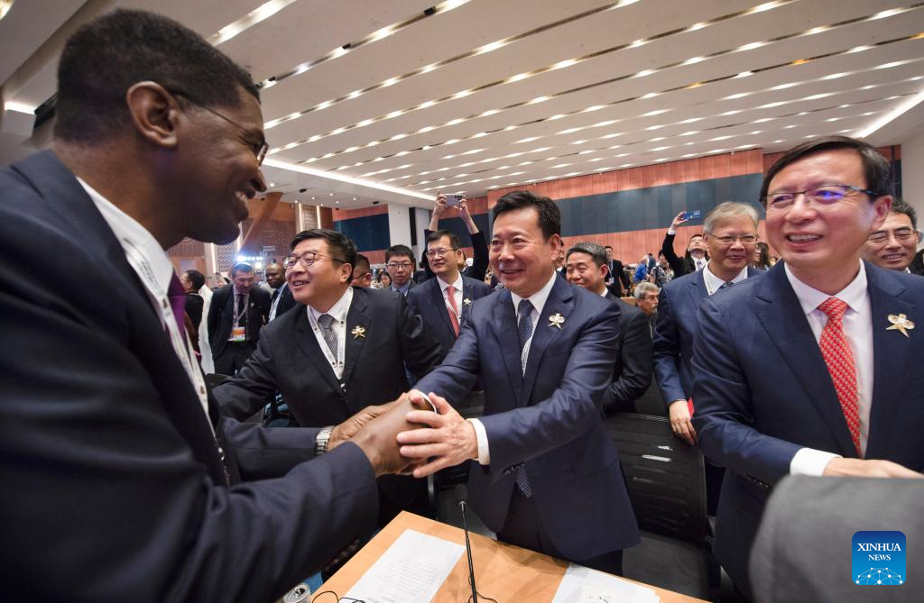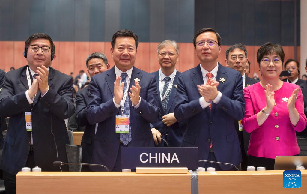 Delegates greet members of the Chinese delegation after the inscription of the Beijing Central Axis on the World Heritage List by the United Nations Educational, Scientific and Cultural Organization (UNESCO) during the 46th session of the UNESCO World Heritage Committee held in New Delhi, India, July 27, 2024. UNESCO on Saturday announced the inclusion of the Beijing Central Axis: A Building Ensemble Exhibiting the Ideal Order of the Chinese Capital, into its world heritage list. (Xinhua/Javed Dar)