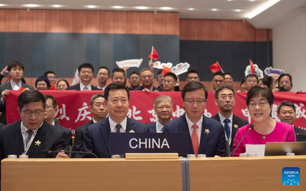 A member of the Chinese delegation (R, front) speaks after the inscription of the Beijing Central Axis on the World Heritage List by the United Nations Educational, Scientific and Cultural Organization (UNESCO) during the 46th session of the UNESCO World Heritage Committee held in New Delhi, India, July 27, 2024. UNESCO on Saturday announced the inclusion of the Beijing Central Axis: A Building Ensemble Exhibiting the Ideal Order of the Chinese Capital, into its world heritage list. (Xinhua/Javed Dar)