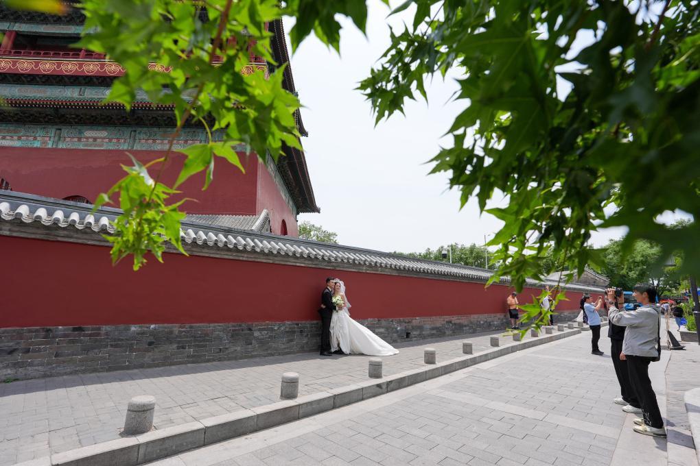 A couple pose for wedding photos near the Drum Tower in Beijing, capital of China, June 2, 2024. The United Nations Educational, Scientific and Cultural Organization (UNESCO) on Saturday announced the inclusion of the Beijing Central Axis: A Building Ensemble Exhibiting the Ideal Order of the Chinese Capital, into its world heritage list.