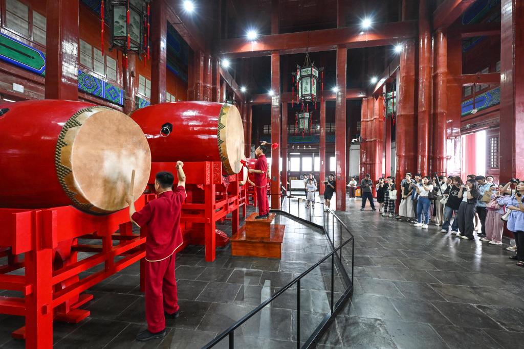 Tourists watch a drum performance at the Drum Tower in Beijing, capital of China, July 16, 2024. The United Nations Educational, Scientific and Cultural Organization (UNESCO) on Saturday announced the inclusion of the Beijing Central Axis: A Building Ensemble Exhibiting the Ideal Order of the Chinese Capital, into its world heritage list.