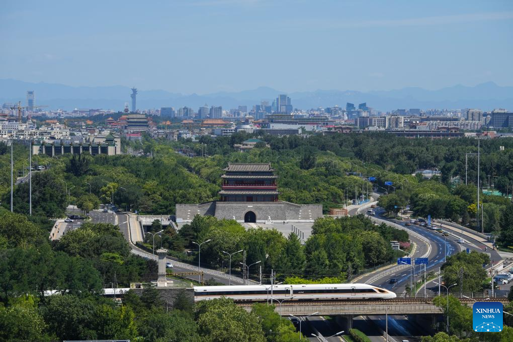 A bullet train runs past Yongdingmen Gate in Beijing, capital of China, July 18, 2024. (Xinhua/Ju Huanzong)