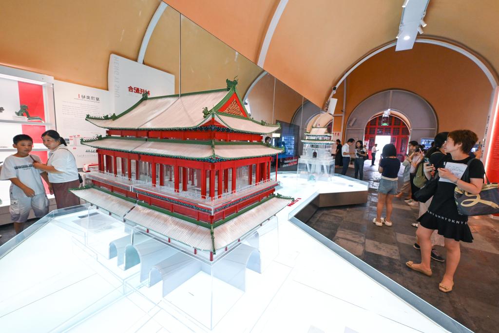 People view models of the Bell and Drum Towers inside the Drum Tower in Beijing, capital of China, July 16, 2024. The United Nations Educational, Scientific and Cultural Organization (UNESCO) on Saturday announced the inclusion of the Beijing Central Axis: A Building Ensemble Exhibiting the Ideal Order of the Chinese Capital, into its world heritage list.