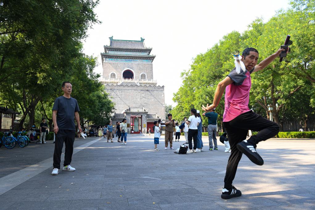 A citizen kicks shuttlecock at a square in front of the Bell and Drum Towers in Beijing, capital of China, July 3, 2024. The United Nations Educational, Scientific and Cultural Organization (UNESCO) on Saturday announced the inclusion of the Beijing Central Axis: A Building Ensemble Exhibiting the Ideal Order of the Chinese Capital, into its world heritage list.