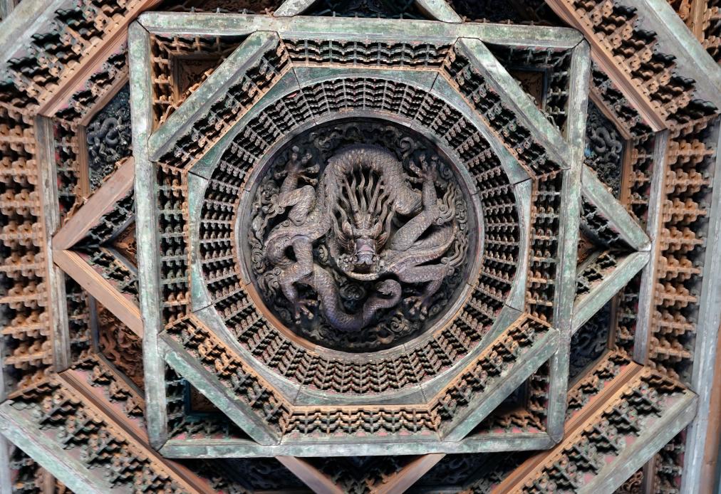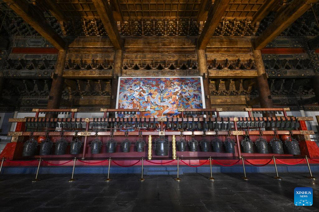 This photo taken on July 17, 2024 shows a caisson ceiling of the Longfu Temple displayed in Taisui hall of the Altar of the God of Agriculture in Beijing, capital of China. The United Nations Educational, Scientific and Cultural Organization (UNESCO) on Saturday announced the inclusion of the Beijing Central Axis: A Building Ensemble Exhibiting the Ideal Order of the Chinese Capital, into its world heritage list.