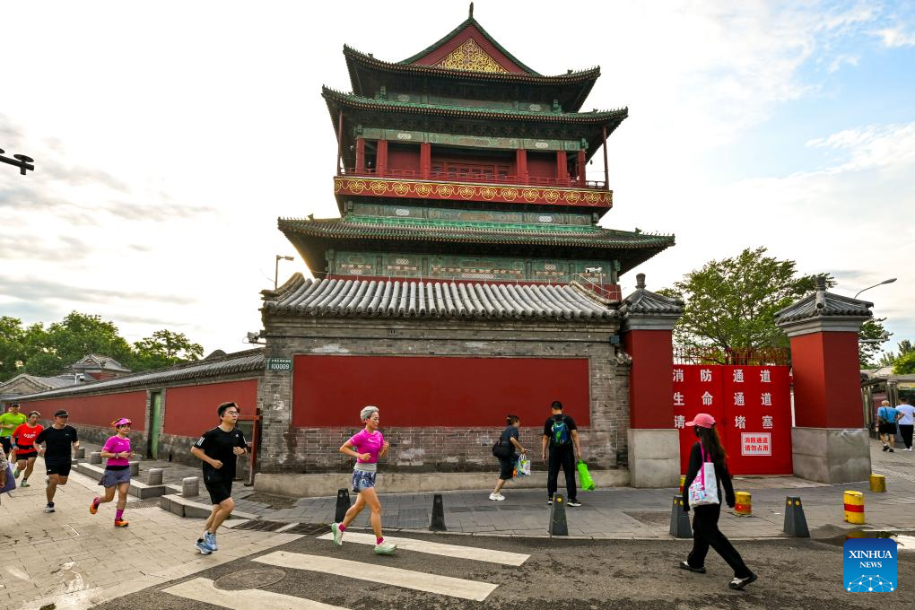 Running enthusiasts run past the Drum Tower in Beijing, capital of China, July 20, 2024. The Beijing Central Axis is a running route full of cultural vibe in the eyes of running enthusiasts. (Xinhua/Liu Jinhai)
