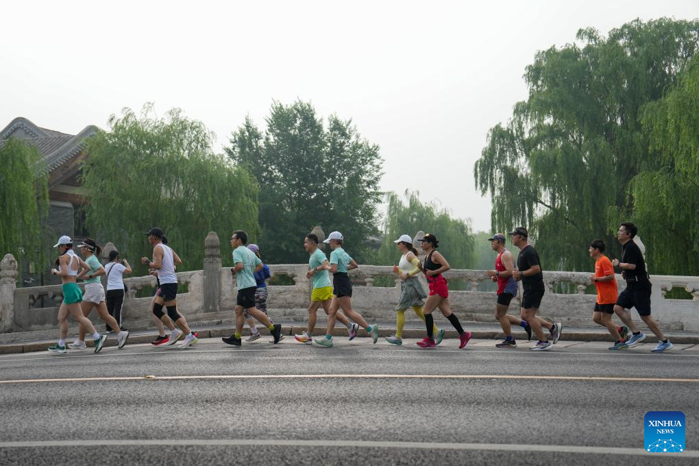 Joggers run on the Wanning Bridge in Beijing, capital of China, June 22, 2024. (Xinhua/Ju Huanzong)