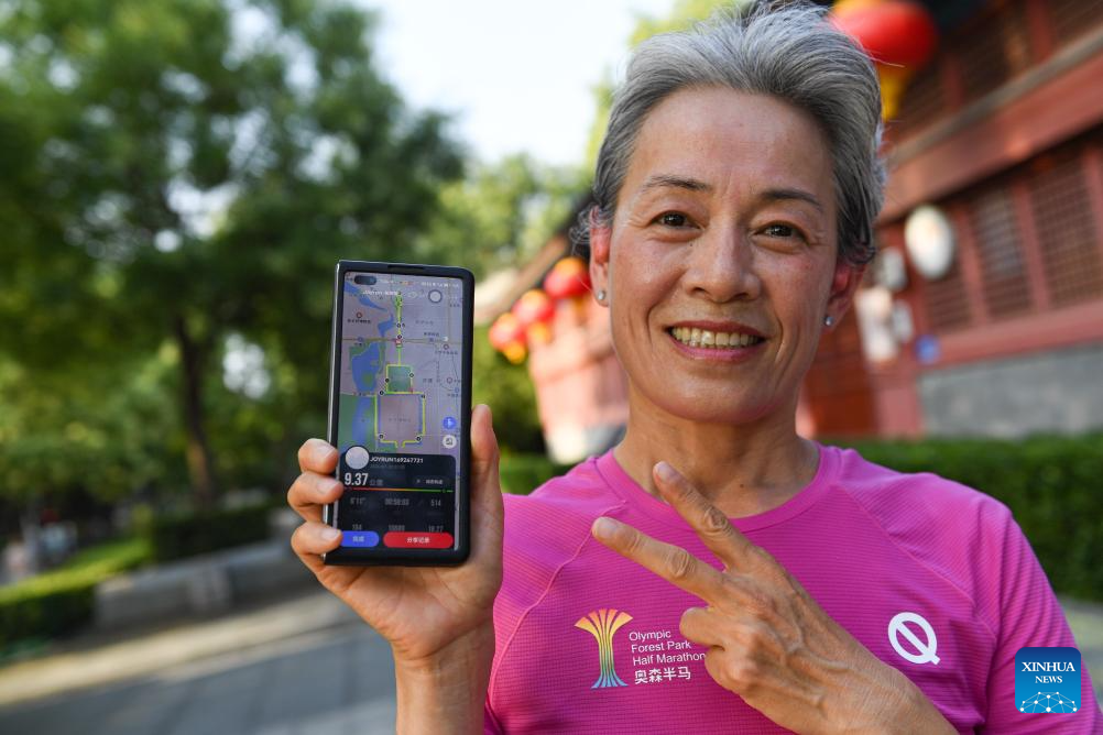 Running enthusiast Liu Jixiang shows her running trace along the Beijing Central Axis in Beijing, capital of China, July 20, 2024. The Beijing Central Axis is a running route full of cultural vibe in the eyes of running enthusiasts. (Xinhua/Chen Zhonghao)